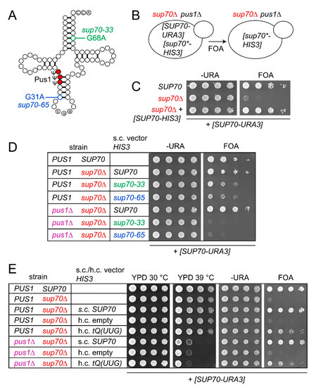 In yeast, the CAG (Gln) codon decoding tRNAGlnCUG is encoded by a single essential gene (SUP70) (Figure 1A) [36]. SUP70 alleles sup70-33 and sup70-65 form tRNAGlnCUG variants which exhibit reduced stability and charging efficiency in vivo but provide sufficient CAG decoding activity to sustain viability in the absence of native SUP70 [31,37,38]. These tRNAGlnCUG variants contain base exchanges G31A (sup70-65) and G68A (sup70-33), destabilizing the acceptor- and anticodon-stems, respectively (Figure 1A). Inviability of sup70 mutants can also be suppressed by overexpression of the inefficient CAG decoder tRNAGlnUUG [39]. In order to assess the in vivo CAG decoding potential of tRNAGlnUUG, sup70-33 and sup70-65 in the absence of Pus1-dependent Ψ, we generated plasmid shuffle strains containing a sup70 deletion complemented with a counter-selectable URA3 construct carrying native SUP70. To this background, a PUS1 deletion was introduced as well as HIS3-selected constructs providing either SUP70, sup70-33, or sup70-65 in single copy (s.c.) or the tRNAGlnUUG gene tQ(UUG) in multicopy (h.c.). Upon 5-fluoro-orotate (5-FOA)-mediated chase out of the SUP70-URA3 vector, the sup70 complementation efficiency of these tRNA genes was inferred by monitoring growth on 5-FOA-supplemented medium (Figure 1B).