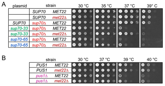 Previously, we observed a strong temperature-sensitive growth (ts) phenotype in yeast cells relying on the sup70-65 variant for CAG decoding [40]. We reconfirmed this result and further demonstrated that sup70-33 is also linked to a robust ts phenotype (Figure 2A). Similarly, mutation of PUS1 is correlated with a milder ts phenotype that slows growth at 38 °C and above [15] (Figure 2B). In some cases, the absence of core modifications in tRNA may trigger degradation by rapid tRNA decay (RTD), which is induced by mild heat stress [18]. To test whether the observed ts phenotypes in sup70-33, sup70-65, and pus1 mutants could be attributable to RTD, we combined these mutations with a met22 deletion and compared growth at elevated temperatures between the MET22 parental strains and the met22 derivatives. As shown in Figure 2A, the ts phenotypes of strains carrying sup70-33 or sup70-65 as the sole SUP70 variant were partially rescued by deletion of MET22. While the sup70-65 strain was severely growth-impaired at 35 °C, the sup70-65 met22 strain exhibited much more robust growth in this condition. A similar improvement was seen for the sup70-33 met22 strain at 37 °C (Figure 2A). Likewise, an improvement of growth at temperatures above 37 °C was observable in the pus1 met22 double mutant as compared to the single mutants (Figure 2B). In contrast to pus1, we found that loss of the Deg1 Ψ synthase modifying U38 and U39 [6] was linked to a MET22-independent ts phenotype (Figure S1). Thus, destabilized tRNAGlnCUG variants and pus1 mutants exhibit ts growth phenotypes that could in part result from activation of RTD, while the phenotype associated with deg1 mutation may result from RTD independent effects. We further tested whether the ts phenotype of pus1 mutants might be mainly due to functional defects in tRNAGln by overexpressing both isoacceptor tRNAs. However, the presence of elevated copy numbers of tQ(CUG) and tQ(UUG) alone or in combination was insufficient to suppress the pus1 phenotype (Figure S2).