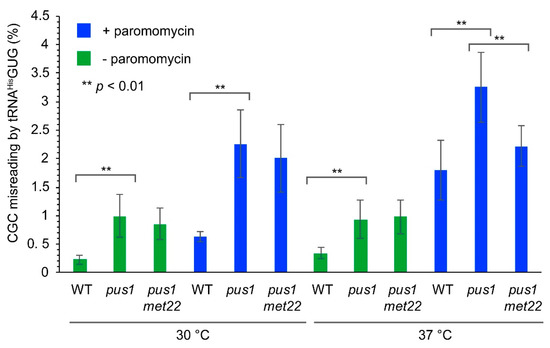 We introduced a dual luciferase (renilla/firefly) construct carrying a CAC (His245) to CGC (Arg245) codon substitution in the firefly luciferase gene, as well a control construct expressing unmodified luciferases into the wild-type and pus1 mutants. The dual luciferase reporter and normalization against the control dual luciferase construct without the H245R substitution allowed the measurement of specific CGC misreading rates by tRNAHisGUG and eliminated any potential impact of mRNA abundance changes on the calculated error rates [35]. Interestingly, the absence of PUS1 caused a significant increase (4.3-fold) in basal CGC misreading, which was, however, not suppressed by additional mutation of MET22 (Figure 6). When paromomycin was added during cultivation (200 µg/mL), we observed increased in error rates in both wild-type and the pus1 mutant. The latter again showed significantly increased (~3.6-fold) CGC mistranslation as compared to the wild-type in the same condition, without a decline in the pus1 met22 double mutant. However, when the aminoglycoside was applied at an elevated temperature (37 °C), CGC misreading in the pus1 mutant was further increased and this effect was dependent on the presence of MET22, since misreading rates in the pus1 met22 double mutant were significantly lower (Figure 6). These results revealed that Pus1-dependent Ψ is involved in the prevention of translational errors at the CGC codon, likely due to a positive contribution of the modification to the efficiency of the natural CGC decoder tRNAArgICG. Since met22 effects were observed for paromomycin-induced mistranslation at elevated temperature, the positive role of Pus1 may in part involve protection from RTD-mediated decay.
