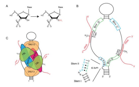 Box C/D snoRNPs. (A) Box C/D snoRNPs catalyze the methylation of the 2′ hydroxyl of RNA. This is thought to reduce the hydrophilic nature of the nucleotides and allow rRNA to be buried inside of the ribosome. (B) Secondary structure of a typical Box C/D snoRNA indicating the location of Box C/C′ (blue), Box D/D′ (green), and hybridized rRNA (red). Location of methylation is denoted as 5′ bps from Box D/D’. (C) Assemblage of protein factors on the snoRNA illustrates that SNU13 binds the K-turns which positions FBL at the site of methylation.