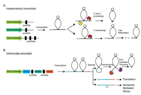 Again the molecular intricacies of snoRNA excision from introns has been covered in depth recently [56], so we will only cover basics here. The basics of processing are similar to that of independently transcribed snoRNA genes: After 5′ and 3′ processing, final maturation takes place by exonucleolytic trimming. However, this can occur via two pathways: A splicing-dependent and splicing-independent pathway [75]. The splicing-dependent pathway appears to be the major pathway. Here, the splicing machinery removes the intron leaving a lariat containing the pre-snoRNA. In this pathway, maturation depends upon linearization by the debranching enzyme [76]. At this point, 5′ to 3′ and 3′ to 5′ exonucleases trim to generate the mature 5′ and 3‘ ends [77]. The second, minor pathway does not rely on intron excision followed by debranching. Instead, a stem structure is formed at the base of the pre-snoRNA that is cleaved, releasing the snoRNA from the larger precursor [75]. Unlike independently transcribed snoRNA genes, intronically encoded genes lack a 5′ cap, instead of containing a 5′ monophosphate generated after exonucleolytic trimming.