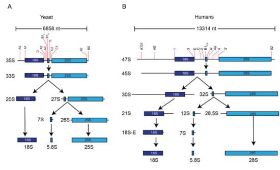 Simplified pathway of rRNA processing. (A) Yeast and (B) human rRNAs are generated from long polycistronic precursor molecules that must be processed to generate the mature rRNAs. This represents a simplified rRNA processing pathway in each organism, based on [94]. Note that there are minor pathways that are omitted from this schematic.