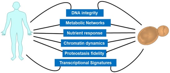 DNA integrity is frequently challenged by the agents reacting with DNA, and the buildup of lesions frequently causes mutations, transcription, and replication block, which subsequently triggers the DNA Damage Response (DDR). The DDR leads to cell cycle arrest and activation of signaling pathways underlying DNA repair, apoptosis, or cellular senescence. Genomic instability is implicated as a causal factor in aging in model organisms and humans []. Inadvertent alterations within the genome are hypothesized to be central to aging. In humans, a high incidence of cancer represents a striking link with increasing age. Indeed, genomic instability is represented as a hallmark of cancer and has been identified in all organisms. Genomic instability in yeast has been extensively studied due to its significant connections to cancer []. Aging yeast cells switch to a condition of high genomic instability during late RLS and persist in that state until they die. Moreover, genome alterations taking place due to defects in DNA repair machinery accelerate aging. For instance, in humans, the clinical phenotype of Werner and Bloom syndrome caused by a mutation in WRN, the gene encoding RecQ DNA helicase, has received the title of an aging hallmark due to genomic instability. Functional WRN rescues telomeres stability and replication stress, and its loss leads to various age-related disorders like arteriosclerosis, osteoporosis, premature greying of hair, diabetes, growth retardation, and cancer []. Interestingly, SGS1 in yeast is the homolog of WRN and dramatically reduced the lifespan when deleted [].