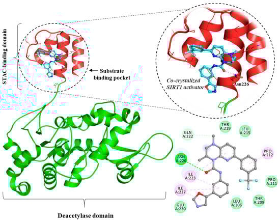 Modulation of sirtuin functions is a critical step in aging pathways throughout eukaryotes and could be regulated by pharmacological interventions. Overexpression and catalytic activation of SIRT1 in mice and the use of small sirtuin-activating compounds (STACs: resveratrol and SRT1720), has been reported to increase lifespan through boosting insulin sensitivity and providing a guard against mitochondrial impairments and oxidative damage []. Pharmacological interventions for increasing SIRT1 activity have been reported to delay aging, and associated disorders such as obesity, inflammation, cancer, autoimmune, neurodegenerative, metabolic, and cardiovascular diseases [,]. STACs improve cellular metabolism and confer protection against biological disorders in old age. Owing to their promising activities, some of the STACs are in clinical trials for the treatment of various disorders []. Understanding of the molecular interface which governs STAC–SIRT1 interactions holds significant promise as a therapeutic intervention for several human diseases [] (Figure 3). Asn226 located in the STAC binding domain is a significant residue that forms an H-bond with the activator []. Glu230 in SIRT1, located in a structurally stable N-terminal domain, was reported to be critical for SIRT1 activation by reported STAC scaffolds. Indeed, SIRT1 activation is attenuated by the substitution mutations at position 230 []. Analysis of the activator–protein interaction surface has identified many potential residues (Figure 3).