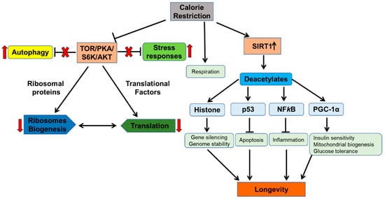Schematic representation of pathways associated with caloric restriction and their downstream effects. The figure represents the conserved underlying response of caloric restriction and how this modulates aging and associated pathways. CR inhibits TOR functions, which result in decreased S6K activity and decreased protein translation, along with increased autophagy. Decreased ribosome biogenesis and translation then inhibits angiogenesis and cell-cycle progression. CR promotes SIRT1 activity which results in the deacetylation of many downstream targets which maintain heterochromatin, establish genomic stability, prevent the expression of pro-inflammatory genes, and decrease cell growth and proliferation, ultimately promoting longevity.