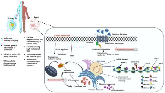 It is evident from many studies that aging brings a plethora of molecular and structural changes that affect the broad cellular physiology of organisms. The interrelations of these changes constitute a complex circuitry to bring about their diverse functions. Many facets of aging are not discussed in this review due to their species-specific effects and some are beyond the scope of the sections included; however, they do contribute towards the overall decline in the regenerative potential of organisms. Some of the unanswered questions remain are the following. How do cells sense aging, and what are the mechanisms which cause cells to learn to die? How are these sensing mechanisms lost in cancer cells to provide them with proliferative potential? How does the mutational load increase in association with aging and what are the underlying drivers? Other aspects of aging-associated features could include feed-back mechanisms that counteract age-related phenotypes. Figure 5 represents the cellular pathways associated with aging and their respective levels in aged cells (refer to the legend of Figure 5).