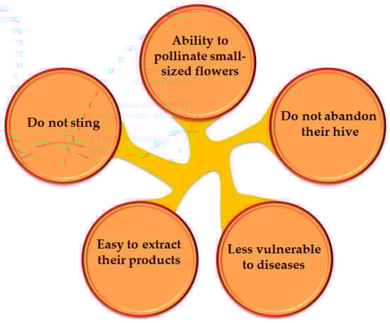 The most common species producing SBH are classified under two main genera, Melipona and Trigona [6]. While stingless bees are one of the most common types of honey producers, the distribution of SBH is lower compared to the more common honey produced by Apis mellifera bees (European/Western bees or honeybees) [7], which has been associated with the limited data about SBH production and its properties. Interestingly, SBH is less used as a nutritional and medicinal product [8], despite its higher nutritional and medicinal properties compared to the commonly used honeybee products (European/Western honey) [9,10,11,12]. It is believed that stingless bee products are superior promising sources of biologically active compounds over honeybees, and this can be attributed to the rich vegetation in the tropical and subtropical regions where stingless bees are found [7]. In addition, stingless bees have some principal characteristics that make them unique compared to honeybees, for example they are less vulnerable to disease (Figure 1). Recent evidence indicates that SBH has potential therapeutic benefits in several contexts, including wound healing, diabetes mellitus, eye diseases, hypertension, fertility defects, cancer, microbial infection and dysregulated lipid profiles [13]. Therefore, promoting the research on SBH would help improve the knowledge on its putative medicinal properties and ensure the conservation of SBH trade.