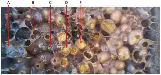 Hive box containing colony of stingless bees (Heterotrigona itama). A, cerumen; B, empty propolis pot; C, honey; D, bee pollen; E, fermented pollen (beebread).