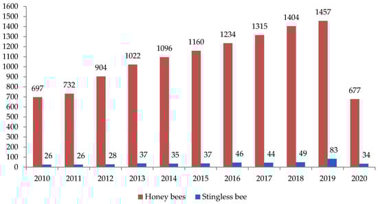 A comparison between the annual publications on both stingless bees and honey bees in the recent 10 years. Applied on PubMed database on May 9, 2020, by using search terms: (Honeybee; Honey bee; Apis; European bee; Western bee) and (Stingless bee; Melipona; Trigona).