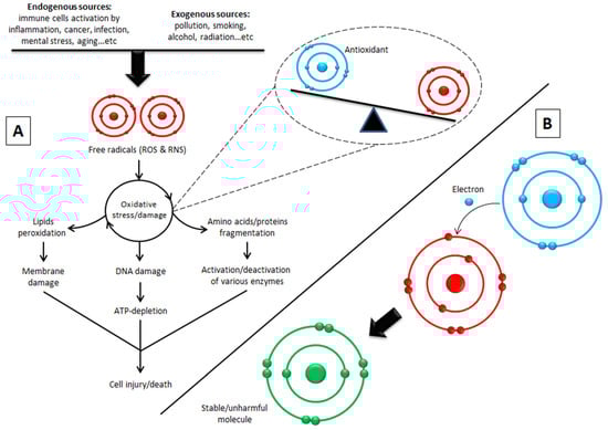 The principal of oxidative damage and the role of antioxidants in scavenging free radicals. (A) The free radicals generated from endogenous sources, at limited concentrations, are considered important for regulation of cell maturation, in addition to their role in immune defense. Excessive concentrations of these unstable molecules can result from illness conditions and exogenous sources, and thus lead to oxidative damage (imbalance between free radical and antioxidant concentrations). This status results in cell injury/death based on the extremely high reactivity of free radicals with vital cellular molecules including lipids, amino acids, proteins and DNA. (B) Antioxidants are necessary to stop the oxidative damage by neutralizing free radicals. They own this unique role due to their capability to give an electron to free radicals that have unpaired electrons to make them stable and unharmful. Phenolic compounds present in stingless bee honey products have antioxidant properties. ROS, reactive oxygen species; RNS, reactive nitrogen species [55,56].