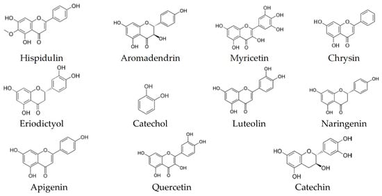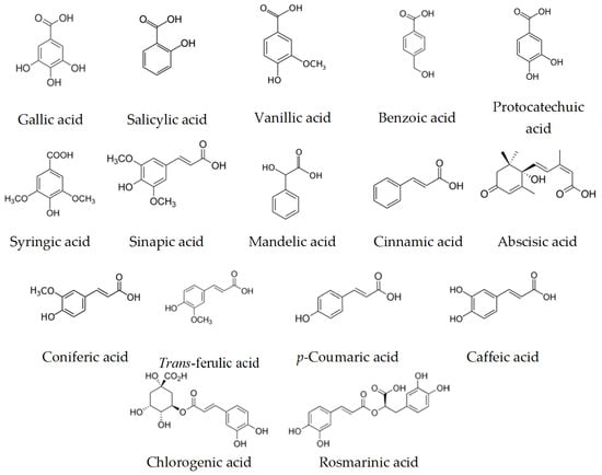 Many studies have explored the total phenolic content (TPC) and the total flavonoid content (TFC), calculated in mg gallic acid equivalent (GAE)/g sample, and the characterization of the phenolic compounds have been performed by different methods, especially the high performance liquid chromatography-mass spectrometric (LC-MS) [59,60]. While the most common assays to detect the antioxidant activity were DPPH (2,2-diphenyl-1-picryl-hydrazyl-hydrate)-free radical scavenging activity, ABTS (2,2′-azino-bis(3-ethylbenzothiazoline-6-sulfonic acid)) radical cation scavenging activity and ferric reducing antioxidant power (FRAP) [16,28,31,59,60]. These three assays considered as relatively inexpensiveness spectrophotometric-based tests based on color quenching or gaining of synthetic organic radicals. The colors of DPPH (purple) and ABTS (blue–green) are reducible upon exposure to antioxidants, and this decrease is negatively correlated with the measured wavelength, which, thus, refers to the antioxidant capacity [61]. While the FARP assay works in reverse; the increase in color density (decrease in wavelength) refers to higher antioxidant capacity. In this assay, ferric-tripyridyl triazine (Fe3+ TPTZ) is colorless and it is convertible to be ferrous (Fe2+) with blue color upon electron donation from antioxidants [62]. Among the several classes of phenolic compounds, a total of 16 phenolic acids (Figure 5), 19 flavonoids (Figure 6) and other five phenolic compounds (Figure 7) have been reported in SBHs at different concentrations [31,59,60,63]. The major compounds that commonly been reported are gallic acid, salicylic acid, p-coumaric acid, kaempferol, naringin, luteolin, catechin, apigenin and taxifolin [31,59,60,63]. The concentration of phenolic compounds differed based on the species of stingless bees and the vegetation at the sites of SBH collection [60]. These findings were supported by a study has compiled compositional data from 152 stingless bee honeys during 42 years (2006–1964) [21].