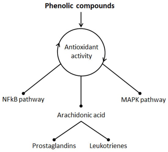 Potential mechanisms of actions for antioxidant phenolic compounds as immunomodulatory and anti-inflammatory agents [66]. These mechanisms work mainly through inhibition of two key signaling pathways; the mitogen-activated protein kinases (MAPK) and the nuclear factor kappa-light-chain-enhancer of activated B cells (NF-κB) and arachidonic acid signaling pathways. This inhibition results in complicated cellular mechanisms finished with suppression of pro-inflammatory gens, and thus block the expression of pro-inflammatory cytokines (e.g., tumor necrosis factor-alpha (TNF) and interleukin (IL)-6). In addition, the phenolic compounds also reduce the release of arachidonic acid which results upon the oxidation of membrane phospholipids, and thus reduce also its metabolites (leukotrienes and prostaglandins) that considered as important inflammatory mediators.
