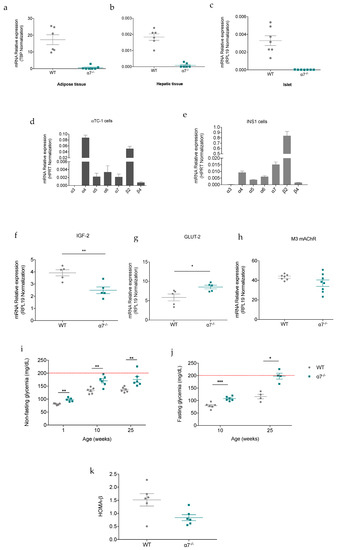 Using RT-qPCR, we found that mouse adipose tissue, liver, and pancreatic islets expressed the α7 nAChR (Figure 1a–c). In addition, α7 nAChR mRNA expression was detected in αTC-1 and INS1 cell lines, which are respectively pancreatic α- and β-cell models (Figure 1d,e). Interestingly, IGF-2 mRNA expression was significantly decreased in α7−/− islets compared to control WT islets (Figure 1f), while GLUT2 glucose transporter mRNA expression was significantly increased (Figure 1g). However, M3 muscarinic acetylcholine receptor (mAChR) expression was not changed (Figure 1h). We measured non-fasting glycemia in α7−/− and WT control mice at different ages. Non-fasting blood glucose concentration was significantly higher in α7−/− mice compared with WT control mice (Figure 1i) from the beginning of the study (1 week of age), thus reflecting elevated glucose levels in response to the lack of α7 nAChR. Indeed, 10- and 25-week-old α7−/− mice displayed glycemia reaching, respectively, a mean of 170.5 ± 8.21 and 175.83 ± 11.13 mg/dL, whereas age-matched WT control mice had mean values of 132.83 ± 4.61 and 136.5 ± 3.98 mg/dL. Although this difference was maintained until 25 weeks of age, non-fasting blood glucose levels in α7−/− mice did not exceed 200 mg/dL, a glycemic value considered as diabetic in mice. Similarly, fasting glycemia (107.67 ± 3.54 mg/dL in α7−/− mice versus 79.34 ± 4.54 mg/dL in WT mice) was significantly increased in 10-week-old α7−/− mice when compared with age-matched WT control mice (Figure 1j). This difference has become more pronounced at 25 weeks of age (Figure 1j), reaching an average value of 197.75 ± 24.14 mg/dL in α7−/− mice and 116,50 ± 9.30 mg/dL in WT control mice. Comparison of mean values of homeostatic model assessment for β-cell function (HOMA-β) index between 10-week-old α7−/− and WT control mice indicates that α7−/− β-cell function tends to be lower (Figure 1k). Together, these observations highlight that α7 nAChR deficiency leads to the development of a mild chronic hyperglycemic state, which is defined as a pre-diabetes [29].