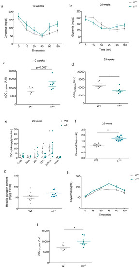 Glucose tolerance tests (GTT) were first performed in awake 10- and 25-weeks-old mice. GTT were performed by intraperitoneal injection of d-glucose (1.5 g/kg body weight, 24379.294, VWR, Fontenay-sous-Bois, France) in normal saline (0.9% NaCl) on overnight fasted mice. One week later, Insulin tolerance tests (ITT) were performed in these same mice by intraperitoneal injection of insulin (0.70 U/kg body weight; Actrapid, NovoNordisk, Bagsvaerd, Denmark) in normal saline (0.9% NaCl) after 6 h of food restriction. Similarly, Pyruvate tolerance tests (PTT) were performed in awake 25-weeks-old mice by intraperitoneal injection of sodium pyruvate (1 g/kg body weight; P2256, Sigma-Aldrich, Saint-Quentin Fallavier, France) in normal saline (0.9% NaCl) after 6 h of food restriction. Blood samples were collected from the tail vein for immediate glycemia measurement using a hand-held glucometer (Accu-Chek Performa, Roche, France). Glycemia was determined at 0, 15, 30, 45, 60, 90, and 120 min after glucose or insulin or pyruvate load. All AUC values were normalized as follows: AUCnormalized = AUCtotal—(the baseline value * 120).