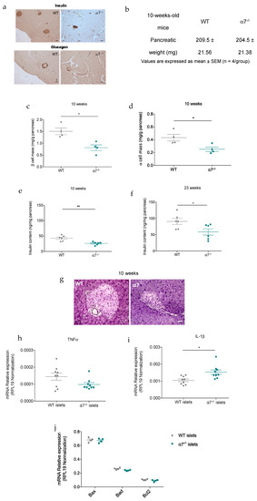 Given that fed and fasting glycemia were significantly higher in 10-week-old α7−/− mice, we investigated the effects of α7 nAChR deficit on pancreatic islet mass in 10-week-old mice. Interestingly, morphometric measurements showed that β- and α-cell mass were significantly reduced in α7−/− mice compared with WT control mice by approximately 48% (Figure 4a–c) and 46% (Figure 4a,b,d), respectively. Moreover, pancreatic insulin content was also significantly decreased in 10- and 25-week-old α7−/− mice (Figure 4e,f), suggesting that β-cell mass is still reduced in 25-week-old α7−/− mice. Since it has been reported that the cholinergic anti-inflammatory pathway was regulated by α7 nAChR [19], we then asked if significant reduction in pancreatic islet mass identified in 10-week-old α7−/− mice was caused by islet inflammation. Hematoxylin and eosin staining of pancreatic sections from 10-week-old α7−/− mice revealed neither inflammation nor islet fibrosis (Figure 4g). Moreover, mRNA expression quantification by RT-qPCR from isolated α7−/− islets indicated that apoptotic marker and pro-inflammatory cytokine levels were not different compared to WT control islets (Figure 4h–j), confirming the absence of pancreatic inflammation in 10-week-old α7−/− mice. Overall, these data suggest that impaired glucose homeostasis in α7−/− mice is related to a reduced islet mass, which is not a secondary consequence of inflammation, thus highlighting a novel role for α7 nAChR in islet mass homeostasis.