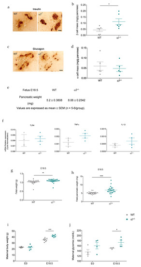 Since we observed that the lack of α7 nAChR induced a pronounced reduction of islet mass, higher non-fasting blood glucose levels in 1-week-old α7−/− mice led us to measure islet mass at embryonic day 18.5 (E18.5) and to investigate whether α7−/− mice were born with a deficit of islet mass. Unlike what we have observed in adulthood, β-cell mass (Figure 5a,b,e) was significantly higher in E18.5 α7−/− fetuses than E18.5 WT control fetuses. In contrast, α-cell mass was similar in both groups (Figure 5c–e). In addition, there was no difference in pro-inflammatory cytokine expression in both groups (Figure 5f), thereby reinforcing the idea that α7 nAChR could be involved in islet mass homeostasis. It is important to note that body and pancreas weight from E18.5 α7−/− fetuses were significantly higher than those from WT fetus (Figure 5g,h), suggesting that these fetuses are macrosomic. Measurements of maternal weight and glycemia at day 18.5 of the pregnancy revealed that α7−/− pregnant mothers exhibit an mild hyperglycemic intrauterine environment (Figure 5i,j).