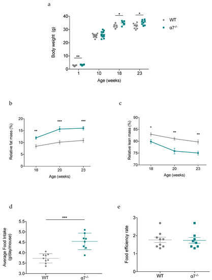 Literature reports that increased body weight and adiposity are hallmarks of insulin resistance [35]. Given that α7−/− mice develop insulin resistance over time, we evaluated the progression of their body weight with age. As expected, body weight was significantly increased in 18- and 23-week-old α7−/− mice compared with age-matched WT control mice (Figure 6a). Besides, body weight at 10 weeks of age was similar (25.34 ± 0.34 g for WT group versus 26.29 ± 0.62 g for α7−/− group, p > 0.3) in both groups (Figure 6a). Higher body weight (2.74 ± 0.12 g for WT group versus 3.30 ± 0.08 g for α7−/− group, p < 0.002) seen in 1-week-old α7−/− pups (Figure 6a) is likely a consequence of mild hyperglycemic intrauterine environment (Figure 5h,j), as previously described [36]. This is agreed with higher body and pancreatic fetal weight in E18.5 α7−/− fetuses (Figure 5f,g), reflecting a macrosomic phenotype that has been maintained during at least the first postnatal week and has returned to normal weight at 10 weeks of age (Figure 6a). Given their more important growth rate, assessment of body composition changes was performed in 18-, 20- and 23-week-old mice. Strikingly, the percentage of relative fat mass at the different ages showed that α7−/− mice gained more weight as fat mass than WT control mice (Figure 6b). More importantly, fat mass gain between weeks 18 and 23 was more pronounced in α7−/− mice (Figure 6b). On the other hand, 18-, 20- and 23-week-old α7−/− mice lost significantly more lean mass compared with age-matched WT control mice (Figure 6c). This difference was also more marked between weeks 18 and 23 in α7−/− mice than in WT control mice (Figure 6c). In addition, α7−/− mice exhibited a disturbed food behavior as shown by average food intake significantly higher than WT control mice between weeks 18 and 23 (Figure 6d). However, their food efficiency was not different as compared to WT control mice (Figure 6e), indicating that food assimilation did not contribute to body weight gain. In summary, insulin-resistant α7−/− mice increased their body weight due to their higher food consumption, which led to an increase in fat mass, a known factor to contribute in the pathogenesis of T2D.