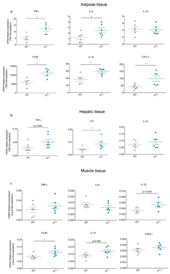 We showed increased body weight gain and adiposity in old α7−/− mice. As it is now well established that inflammation, and particularly in adipose tissue, is a hallmark of insulin resistance and obesity [37,38], we thus reasoned that inflammation also could occur in adipose and peripheral tissues and be associated with the overweight and insulin-resistant phenotype we observed. We studied this possibility by measuring pro-inflammatory gene expression such as TNFα, IL-1β and IL-6. As shown in Figure 7, adipose tissue in 25-week-old α7−/− mice had significantly higher expression of genes encoding for TNFα, IL-6, F4/80 and IL-15 as well as CXCL1 (Figure 7a), which are associated with obesity [39,40]. IL-6 mRNA expression level was significantly enhanced in liver tissue whereas TNFα mRNA expression markedly trended to be higher (p = 0.055) in 25-week-old α7−/− mice than age-matched WT mice (Figure 7b). However, expression of IL-1β gene, in adipose tissue (Figure 7a) and liver (Figure 7b), was similar in both groups of mice. In muscle tissue, IL-1β and F4/80 mRNA expression were significantly increased from 25-week-old α7−/− mice compared with age-matched WT control mice (Figure 7c), whereas IL-15 mRNA expression tended to be higher (p = 0.065) in 25-week-old α7−/− mice (Figure 7c). We concluded that levels of pro-inflammatory markers were much higher in adipose tissue than muscle tissue and liver in 25-week-old α7−/− mice, supporting an association of insulin resistance and body weight gain with increased inflammation.