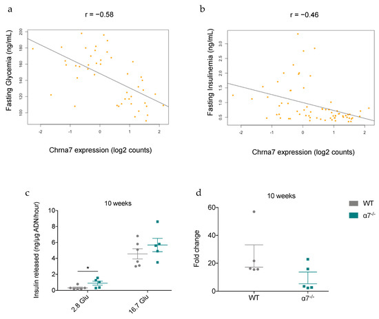 In parallel, metabolic phenotyping measurements in high-fat-fed male mice from six commonly used non-diabetic mouse strains, including C57Bl6/J strain, were recorded at 2 days, 10 days, 30 days, and 90 days to evaluate diabetes progression. To identify metabolic phenotype-related genes, RNA sequencing was performed on pancreatic islets from these mice, which express α7 nAChR. Transcriptomic analysis was performed at each time-point and integrated with the phenotypic data. Our results identified Chrna7 gene, encoding for the α7 subunit of nAChR, as being one of several genes related to fasting glycemia and fasting insulinemia (Figure 8a,b). Its expression in islets was significantly and negatively correlated with fasting glycemia (r = −0.58, p value = 1.7 × 10−5) (Figure 8a) and fasting insulinemia (r = −0.46; p = 0.001) (Figure 8b), thus confirming our results observed in 25-week-old α7−/− nAChR mice (Figure 1j and Figure 2i). Next, we studied insulin secretion, in freshly isolated islets from 10-week-old mice, in response to 2.8 mM and 16.7 mM Glucose. In agreement with our transcriptomic data, we found that basal insulin secretion in 2.8 mM glucose was significantly increased by approximately 3-fold in freshly isolated α7−/− islets when compared with WT controls (Figure 8c). However, the difference was not significant at 16.7 mM Glucose (Figure 8c). The fold change by glucose at 16.7 mM over that at 2.8 mM glucose was not statistically significant but exhibited a trend for decrease in isolated α7−/− islets (Figure 8d), indicating the onset of deterioration of β-cell function.