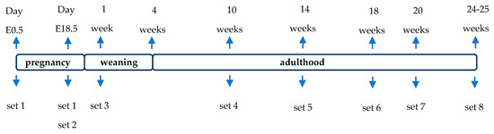 Schematic representation indicating the set of animals studied over time. Set 1 = pregnant mice; Set 2 = E18.5 fetuses; Set 3 = pups (1 week old); Set 4 = 10-weeks-old mice; Set 5 = 14-weeks-old mice; Set 6 = 18-weeks-old mice; Set 7 = 20-weeks-old mice and Set 8 = 24/25-weeks-old mice.