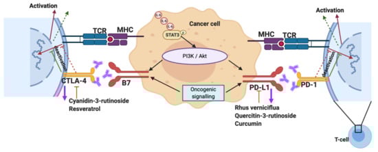 Phytochemicals in their naturally active form have also shown promise as immunomodulatory agents in cancer. For example, the phytochemical shikonin, isolated from the root tissues of the herb Lithospermum erythrorhizon, has been demonstrated to enhance the immunogenic cell death response toward tumour cells, augmenting dendritic cell vaccine activity in vivo, increasing cytotoxic T cell activity and reducing tumour growth, often via the release of damage-associated molecular patterns (DAMPs) [,,]. In addition, pretreating cancer cells with shikonin results in a reduced effective dose of the chemotherapy agent doxorubicin, giving promise to the strategy of using phytochemicals in the development of dendritic cell vaccines and in the use of combinatorial drug treatments []. Shikonin has been demonstrated to target the SH2 domain of STAT3 resulting in the suppression of IL-17-induced vascular endothelial growth factor (VEGF) expression, sensitization to gefitinib and the induction of tumour cell apoptosis [,,,]. Other phytochemicals, such as Ganoderma lucidum polysaccharides, have been demonstrated to alter the ratio of lung tumour associated CD4+ and CD8+ T cells []. Whilst curcumin has also shown promise in restoring progenitor, effector and circulating T cells in tumour-bearing mice, via Stat5a-mediated Bcl-2 induction []. Recent studies have also shown the beneficial therapeutic effect of phytochemicals on STAT3-mediated PD-1 and CTLA-4 expression on T cells (Figure 3). The active compounds in black raspberry extract (Cyanidin-3-Rutinoside, Quercitin-3-rutinoside) reduced the expression of immune checkpoint receptors CTLA-4 and PD-1 and affected CD4+ and CD8+ T lymphocyte proliferation, whilst reducing the in vitro expansion of myeloid-derived suppressor cells []. In a high-fat diet-induced obesity mouse model, resveratrol significantly reduced CTLA-4 expression in regulatory T cells [], demonstrating results similar to those reported elsewhere in an inflammatory bowel disease model [,]. Furthermore, studies show that active compounds in Rhus verniciflua Stokes extract, used in Korean herbal medicine, successfully blocked the expression of both PD-1/PDL-1 and CTLA-4 [,,].