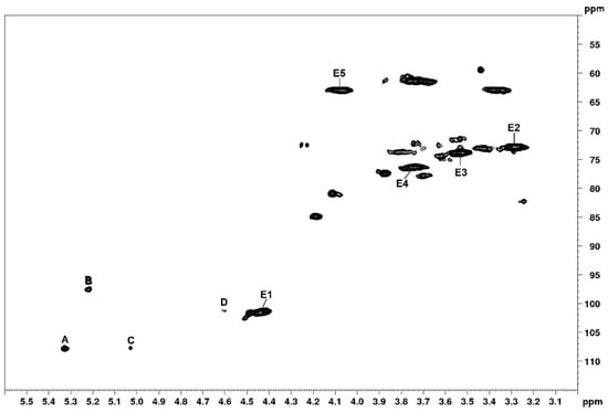 Two-dimensional NMR analysis was carried out to confirm that it was xylan that was extracted from the corn cob meal. Xylan’s HSQC spectrum (Figure 1) includes five major anomeric 1H/13C cross-peaks named A, B, C, D, and E. Unit E shows an intense anomeric correlation at 4.44/101.6 ppm, thereby confirming the presence of higher amounts of monosaccharide residues. Additionally, signals A and B have similar intensities. Signals C and D have similar intensities.
