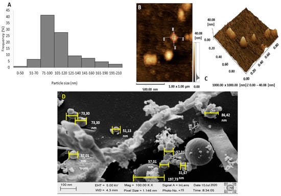 The mean size of our particles was like that observed by Chen and colleagues (102.00 nm) []. It is worth noting that these authors synthesized silver nanoparticles with fungal cell wall polysaccharides. This size is promising in light of the findings reported by Coradeghini et al. [] and Elsabahy and Wooley [], who have shown that nanoparticles with sizes between 20 and 200 nm in suspension are particularly useful in vivo because they are less likely to induce toxicity, as they do not incur as much membrane damage as that incurred by larger molecules.