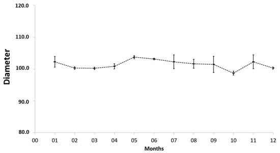 To verify the stability of these particles, their size was periodically measured over a 12-month period, and the results are shown in Figure 6. The mean size of nanoxylan was 102.3 ± 1.70 nm in month one and 100.3 ± 0.40 nm in month 12, but these were not statistically significant differences, suggesting that these nanoxylans were reasonably stable.