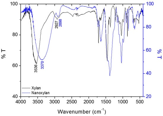 The infrared spectra for the xylan and nanoxylan are shown in Figure 7. The vibrational modes observed at 3536 and 3370 cm−1 can be attributed to the OH stretch present in xylan and nanoxylan, respectively.