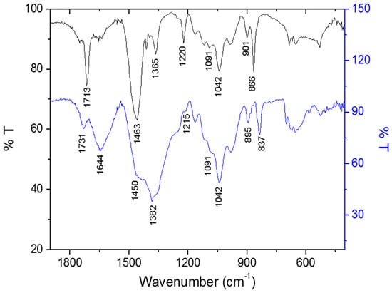 Overlapping infrared spectra for xylan (in black) and nanoxylan (in blue) between 4000 and 400 cm−1.