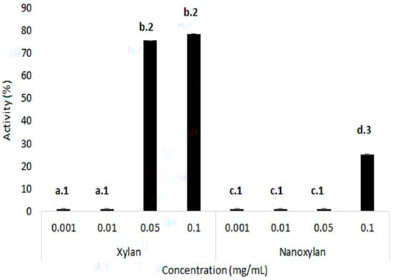 Table 1 shows the results obtained from the chemical analysis of the xylan. Xylose (50%) was the major polysaccharide in these extracts but there were also relevant quantities of glucose and arabinose (>10%). There were also several less significant contributors (less than 10%), including galactose, mannose, and glucuronic acid. Additionally, the xylan extracts presented with low levels of proteins and phenolic compounds. For comparison, Table 1 also summarizes the chemical composition of the xylan produced by Melo-Silveira et al. [].