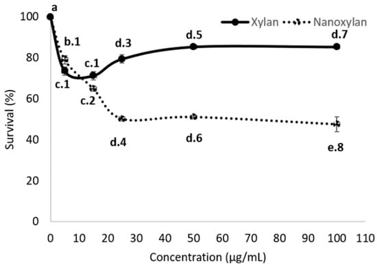 The cytotoxicity of xylan and nanoxylan was evaluated using the mitochondrial reduction in MTT. Briefly, this assay evaluates the cellular capacity to reduce 3-(4,5-dimethylthiazol-2-yl)-2,5-diphenyltetrazolium bromide (MTT) to formazan, thereby indicating that these cells are metabolically active. A total of 1 × 103 3T3 cells were incubated in Dulbecco’s modified Eagle medium (DMEM) (control), DMEM with xylan (1.95, 3.91, 7.81, 15.63, 31.25, 62.5, 125, 250, 500 and 1000 µg/mL) or DMEM with nanoxylan (1.95, 3.91, 7.81, 15.63, 31.25, 62.5, 125, 250, 500 and 1000 µg/mL) at 37 °C for 24 h. The medium was then removed and MTT in DMEM was added and incubated for 4 h. Then, the medium was aspirated, and the formazan crystals were dissolved in 96% ethanol. Absorbance was measured at 570 nm.