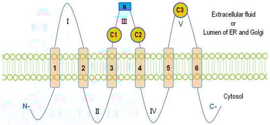 The membrane topology of lipid phosphate phosphatases (LPPs). Six membrane-spanning regions (1–6) are connected with five extramembrane loops (I–V). Three conserved catalytic domains, C1, C2, and C3, are located on loops III and V. The N-linked glycosylation site on the loop III is shown as a blue square.