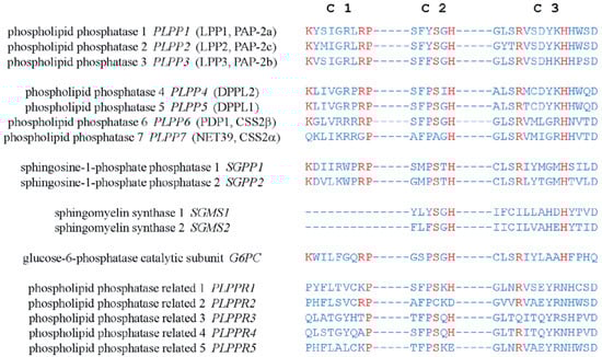 Amino acid sequences of the conserved catalytic domains, C1, C2, and C3, in human LPPs and other proteins with structure similarity. Residues critical for the catalytic activity are shown in red.