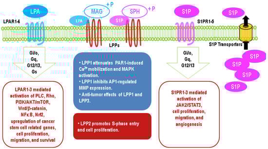 Both LPA and S1P outside the cells induce a plethora of cellular responses such as proliferation, migration, angiogenesis, and inflammation [51,60,61,62] through receptors on the cell surface. To date, six LPA receptors (LPAR1–6) and five S1P receptors (S1PR1–5) have been identified and all of them are G protein-coupled receptors (GPCRs). Plasma membrane-localized LPPs dephosphorylate extracellular LPA and S1P and thereby attenuate LPA/S1P signaling.