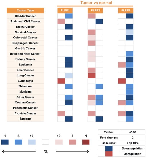 The downregulation of LPPs results in an exacerbation of the excessive LPA and S1P signaling in cancers. LPP1 and LPP3 levels are significantly decreased in colon and breast tumors compared with the normal tissue [208,209]. Microarray data also demonstrated the downregulation of LPP1 or LPP3 in many other cancers [210,211,212]. We compared mRNA levels of LPP1–3 in all the tumors versus normal datasets of the Oncomine database, with the following threshold settings: p value, 0.05; fold change, 2; gene rank, top 10%. The results showed that LPP1 expression is significantly downregulated in melanoma, sarcoma, leukemia, bladder, breast, colorectal, kidney, lung, and ovarian cancers, and it is upregulated in lymphoma, brain and central nervous system, and prostate cancers. LPP3 is downregulated in melanoma, myeloma, sarcoma, bladder, breast, cervical, colorectal, lung, kidney, liver, and head and neck cancers, and it is upregulated in lymphoma.
