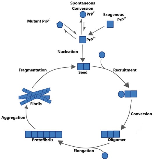 Models based on kinetic data suggest that the conversion of native protein is catalyzed largely by oligomeric ‘seeds’, rather than fibrillar aggregates []. Consequently, the fragmentation of fibrils into seeds has been described as a crucial step during the propagation of prions and prion-like misfolded proteins. Additionally, oligomeric species are also considered to be the main mediators of neurotoxicity in PMDs. While the subject of toxicity is beyond the scope of this review, we refer the interested reader to [,,,] for a detailed discussion of this topic.