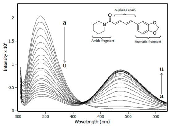 Piperine (Figure 1) is an alkaloid found in some piper species such as Piper nigrum (black pepper) and Piper longum (long pepper). Piperine is not only present as a seasoning but also in various preparations of traditional medicine, including the oldest medical science, practiced in India since antiquity (Ayurveda) [4]. The molecular structure of piperine is composed by two different groups that are electronically conjugated: a methylenedioxybenzene and an oxopentadienyl chromophore [5], leading to characteristic ultraviolet (UV) absorptions at 244, 255, 310 and 342 nm (Figure S1). Piperine has been widely studied by the scientific community because of its anti-inflammatory, anti-carcinogenic, immunomodulatory and hepatoprotective activities [6].