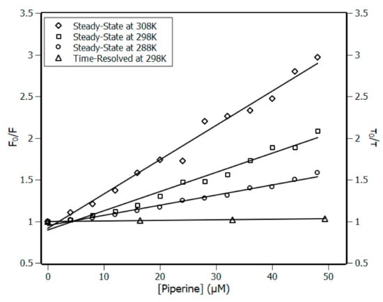 where F is the observed fluorescence intensity, F0 is the fluorescence intensity in the absence of piperine and τ0 is the Trp120 lifetime in the absence of piperine.