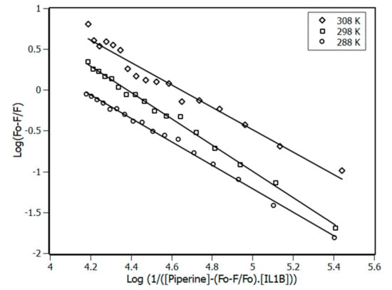 Double-log plots for the fluorescence quenching of IL-1β (4 μM) by the presence of piperine at 288, 298, and 308 K. R2 > 0.98.