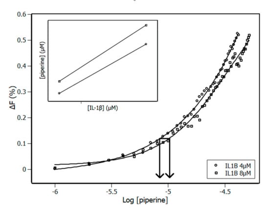 The IDF method was applied in this complex as a second method to obtain an in-depth description of the binding site of IL-1β. It is a methodology used to treat experimental data, but differently from the binding equilibrium model, IDF does not make use of any model a priori; instead, it makes use of the mass conservation law [28]. Because of that, the advantage of applying IDF is the possibility of not only determining the number of binding sites but also identifying possible cooperativity occurrence. IDF considers that, if the free ligand concentration ([piperine]free) is the same at two or more different concentrations of total protein ([IL-1β]), the average interaction density (Συi) will also be the same, and consequently the system will have the same variation in the percentage of quenching (ΔF). The percentage of fluorescence quenching is given by Equation (9), where F is the observed fluorescence signal of IL-1β at the presence of piperine and F0 without piperine. Figure 5 shows the plot of ΔF versus log [piperine] for two known concentrations of IL-1β, both adjusted by a sigmoidal function.