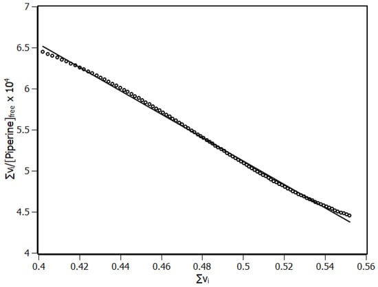 According to the IDF results, the Scatchard plot was built (Figure 6). This plot presented a unique linear profile, indicating that all IL-1β binding sites for piperine are equivalent and independent, exhibiting a non-cooperative state [29]. The number of sites (n) and the binding constant (Kb) were obtained through linear regression based on Equation (11).