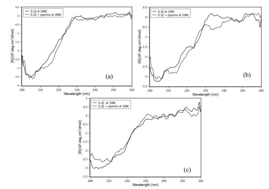 Circular dichroism experiments were performed to distinguish the possible influence of temperature and piperine in the secondary structure of IL-1β (Figure 7).
