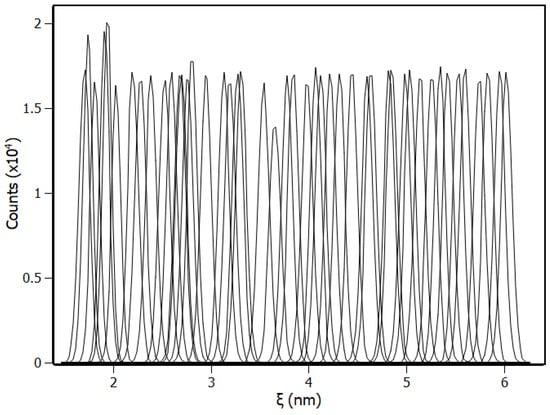 To confirm the binding site predicted by molecular docking, the dissociation process was simulated through biased molecular dynamics, and the configurations obtained between the bound and unbound states were used for umbrella sampling. The theoretical binding energy of the complex (∆Gpred) was calculated by means of the potential mean force (PMF) and compared with the experimental binding free energy ∆G obtained from the thermodynamic parameters (see Section 3.2). During the pulling simulation, piperine was pulled from the protein in the z direction until the energy remained stable, which indicated that the ligand dissociated from the IL-1β and the intermolecular interactions between the piperine and the IL-1β were not significant anymore. To assure a high sampling of the system and that most of the system conformations were accessed, the system was sampled with windows of 0.1 nm of distance between each configuration (Figure 9). According to Figure 9, the high sampling was verified by the overlapping of the histograms of the configuration for each umbrella window.