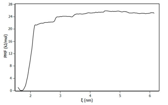 According to the PMF results (Figure 10), the predicted binding free energy at 298 K was (−25.6 ± 1.2) kJ/mol, corroborating with the experimental binding free energy determined by the van’t Hoff analysis (−25.09 ± 0.09) kJ/mol (Table 2). This result confirms the binding site disclosed by molecular docking.
