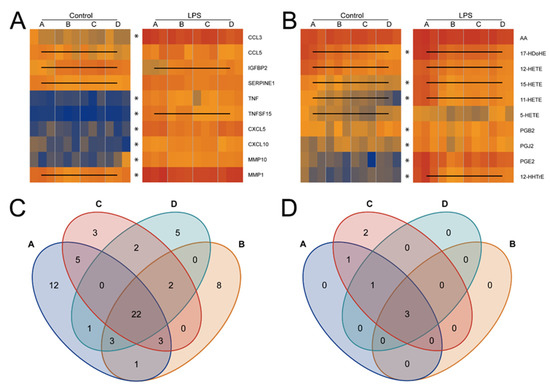 Heatmaps of selected proteins (A) and eicosanoids (B) determined in secretomes of control and LPS-treated U937 cells cultured with the indicated batch of FCS, A, B, C or D. Lines within a heatmap indicate a significant difference of the given molecule within at least two batches. Asterisks (*) indicate that LPS-treatment induced a significant increase. Venn diagrams of significantly up- and downregulated (C) proteins (S0 = 2, FDR = 0.01) and (D) eicosanoids comparing LPS activation with control samples for all four FCS batches (A–D).