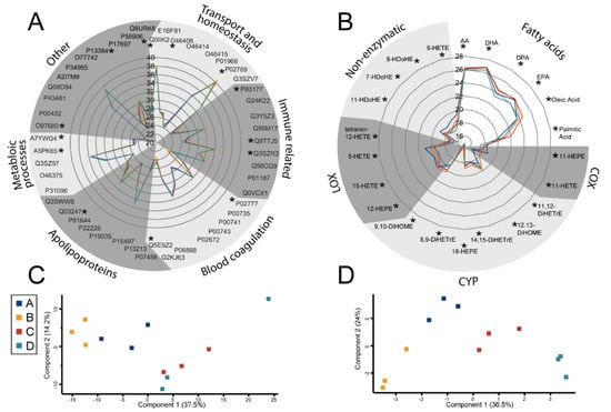 Radar plot for selected proteins (A) and fatty acids (B) identified in 4 different FCS batches without incubation with cells (baseline levels). Principal component analysis of protein (C) and eicosanoid (D) measurements of the same FCS batches, as indicated by different colors, demonstrates superior clustering in the case of eicosanoids. Asterisks mark significantly regulated molecules.