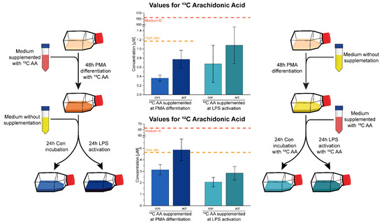 For the investigation of the uptake and release of PUFAs an experiment was carried out with the supplementation of 1,2,3,4,5-13C arachidonic acid (C13 AA, Cayman chemicals, Ann Arbor, Michigan, USA). Whenever C13 AA was added, a control experiment was supplemented with the same concentration of unlabeled arachidonic acid. For the first experiment the C13 AA was added at a concentration of 1.6 µM (used for all AA supplementations) to the fully supplemented medium during the 48 h PMA differentiation step. This concentration is around double that of the endogenous arachidonic acid, thus the supplementation tripled the concentration of biologically active arachidonic acid. Afterwards, the now adherent cells were washed three times with PBS and medium without supplemented AA was added together with or without LPS for 24 h. For the second experiment the cells were differentiated with PMA in standard medium, washed three times with PBS and medium supplemented with C13 AA was added together with and without LPS for 24 h. The eicosanoids were collected and measured in the supplemented medium without incubation (t0), after 48 h PMA differentiation and after 24 h LPS activation. The experimental setup is illustrated in Figure 3.