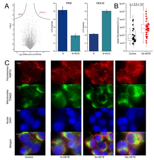 (A) Eicosanoid levels of 5-HETE and 15-HETE for FCS-B (before spiking), FCS-A and FCS-B after spiking with 5-HETE and 15-HETE. (B) Volcano plot for cytoplasmic proteins obtained from U937 cells after PMA differentiation when cultured in either FCS-B or FCS-B supplemented HETEs. Bar plots exemplify the significantly regulated proteins PKM and PEX16. (C) Immunofluorescence detection of peroxisomes (red, PMP70 antibody), mitochondria (green, TOM20 antibody) and nuclei (blue, DAPI) shown for control and increasing concentrations of supplemented HETEs (addition of 1, 3, or 10 times of the spiked HETE mix).
