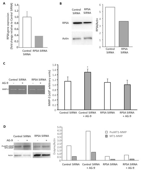 Cells were transfected with control or RPSA siRNA. RPSA gene expression was measured 48 h post-transfection (A) and protein expression was measured 72 h post-transfection (B). For MMP-2 secretion (C) and MT1-MMP expression (D) studies, cells were incubated for another 24 h with or without 10−7 M AG-9 peptide. *: p < 0.05.